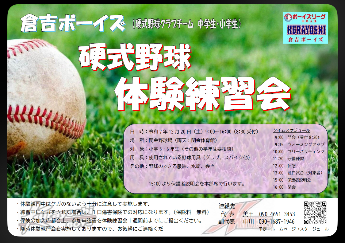硬式野球体験練習会のお知らせ